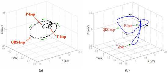 As , varies cyclically in both amplitude and direction, keeping the origin fixed, depicting a 3D spatial loop in (the well-known VCG). As an example, Figure 2a displays a typical VCG loop during a normal cardiac cycle, while Figure 2b depicts the VCG loop with a nodal rhythm disease.