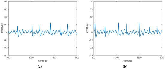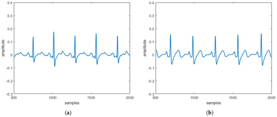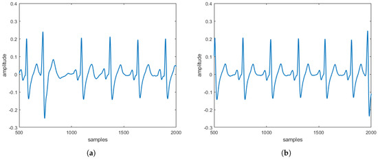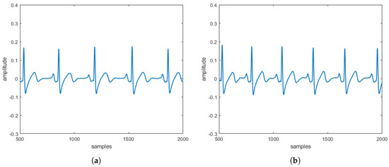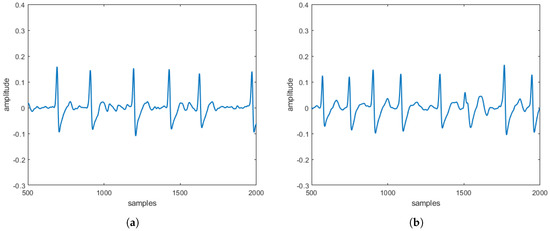 It is worth observing how the s obtained by numerical solution of McSharry models (see Figure 3a,b and Figure 4a) are qualitatively quite similar to the s obtained by clinical investigation of patients not affected by pathologies (a typical related to a subject not affected by pathologies is shown in Figure 4b). However, a quantification of this similarity is required. In this regard, please refer to Section 10.