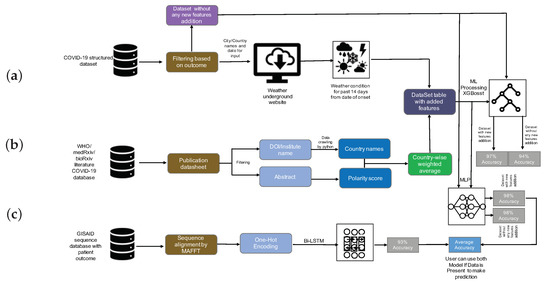 Analysis summary. (a) The initial COVID-19 structured dataset was filtered for patients for which the outcome has been recorded, and then, for these items, the weather was determined using the Weather Underground website [38]. (b) The WHO, medRxiv, and bioRxiv COVID-19 literature database were filtered and preprocessed to extract author institute/address/country, and these were postprocessed so as to obtain a country-wise research sentiment polarity score. XGBoost and Multi-Layer Perceptron (MLP) were trained on both the initial and the enhanced structured data, and the accuracy of survival prediction was shown to be 94% and 97% (using XGBoost), and 98% and 98% (using MLP), respectively. (c) Bidirectional Long Short-Term Memory (Bi-LSTM) was used to train a classification model on the sequence dataset, the accuracy was 93%. Finally, the MLP model and Bi-LSTM models were stacked to jointly predict outcome.