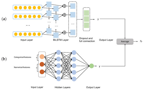 Ensemble deep learning model. (a) The MLP is trained on the structured dataset. (b) The Bi-LSTM model is trained on the sequence dataset. The two models are stacked in the prediction step.