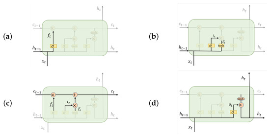 Operation of gates in an LSTM cell. The LSTM determines the hidden state and cell state at the present sequence location as follows. (a) A forget gate controls the input of the ()th hidden state, (b) an input gate controls the input of , (c) a transitional phase calculates the tth positions cell state, and then, finally, (d) an output gate returns the tth position’s hidden state .