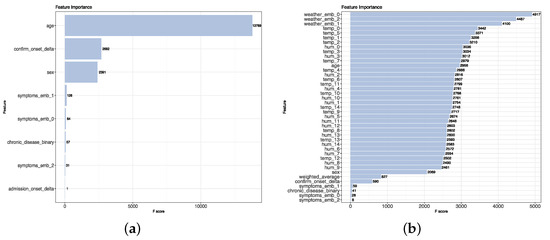 Feature scores on the enhanced structured dataset. (a) XGBoost processing of the initial structured dataset identified age as an important feature. (b) XGBoost processing of the enhanced structured dataset identified in the weather as an important feature.