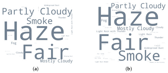 Textual weather description. (a) Word cloud visualization of the frequency of textual weather description for survivors. (b) Word cloud visualization of the frequency of textual weather description for non-survivors.