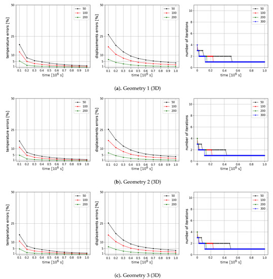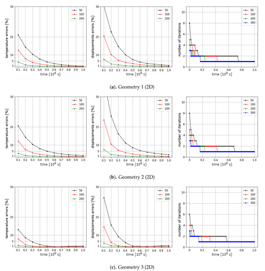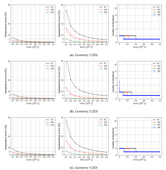 In this section, we present the results of numerical simulations for two- and three-dimensional model problems. In particular, we numerically examine the presented approximation for different time step sizes and their influences on the number of nonlinear iterations. We present errors for temperature and displacements between the given solution and reference solution using a smaller number of time steps. Finally, we discuss the computational time of the presented implementation.