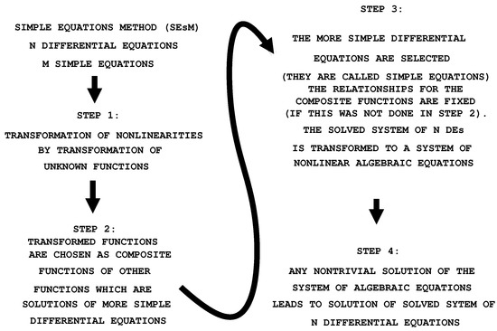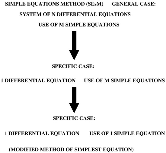 Below, we discuss the simple equations method. It is an algorithm for obtaining exact and approximate solutions of nonlinear differential equations. The method was designed for the search of the solutions of systems of n nonlinear differential equations. The solution was constructed by the solutions of m simpler differential equations (Figure 1). The most applications of the algorithm up to now have been to obtain solutions of one nonlinear differential equation. This solution is searched as a function of the solution of one simple equation. The corresponding specific case of the SEsM is called the Modified Method of Simplest Equation (MMSE). Other kinds of examples exist as well. They present the solution of the solved nonlinear differential equation, which is a function of the solutions of several simple equations. Such examples can be seen in Section 3 below.