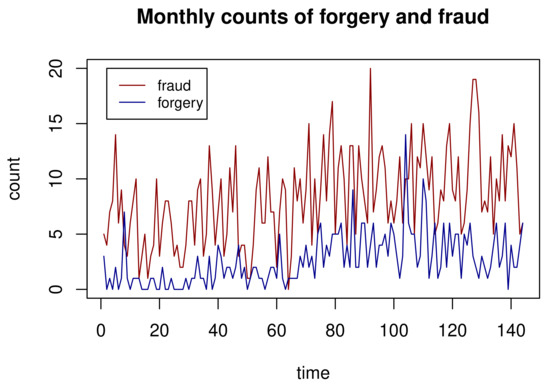 We considered monthly counts of forgery and fraud in the 61st police car beat in Pittsburgh, PA. For a selected county, two count time series were selected to fit the proposed bivariate Poisson class of models. The empirical means for the two count time series were 2.632 and 8.243, respectively. The cross-correlation between the two time series was 0.307, which provided sufficient evidence that the two series are dependent. Monthly counts of forgery and fraud are displayed in Figure 1. The fraud count series has higher counts and larger fluctuations when compared to the fraud time series over time. Figure 2 shows the distributions of the count via bar plots and sample autocorrelation functions (ACFs) for the forgery and Fraud count series, respectively. The bar plots suggest that both counts follow Poisson distributions, whereas the ACFs indicate that the two series are serially dependent. Hence, we can now investigate both types of dependences properly using the proposed method of bivariate Poisson time series.