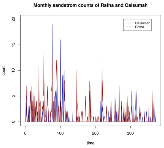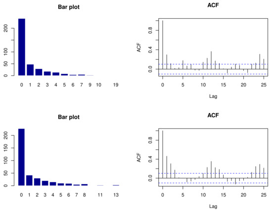 The two sandstorm count series are shown in Figure 3. The plot shows that there exist the frequent occurrence of zeros for both time series. The bar plots and ACFs of sandstorm counts for Rafha and Qaisumah are shown in Figure 4. The plots show that there exists the frequent occurrence of zeros and low-ordered autocorrelation. Hence, we applied the bivariate ZIP distribution to model the sandstorm counts.
