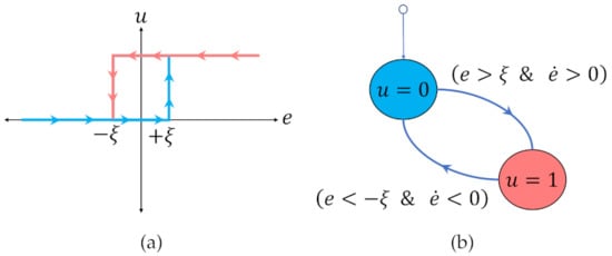 where is the hysteresis function, whose discontinuous behavior and memory feature are shown in Figure 3. Here, Figure 3a describes the nonlinear law in the error space, illustrating how the control transition occurs from 0 to 1 and vice versa. Note that such a control logic is determined for the hysteresis amplitude parameter, namely . For numerical simulations purposes, Figure 3b represents the hysteresis control logic as a state machine, illustrating the memory property and the error dynamics conditions to make the control state transitions, defined as and .