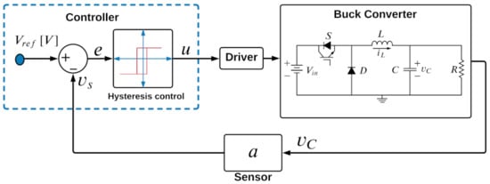 Schematics of the closed-loop control for the Buck converter using the hysteresis control is shown in Figure 4. The driver module corresponds to the interface gate circuit between the electronic controller and the power stage, whose function is to enable/disable the power transistor acting as the switch S. More in detail, the voltage output in the Buck converter load R is measured using a resistive divider as sensor, which provides the feedback signal , to the voltage hysteresis controller. The tracking error e is computed by comparing the desired voltage to the actual measured voltage . Then, based on the error information and hysteresis amplitude [V], the hysteresis control law chooses the right control state value, or , to trigger the power transistor in the Buck converter.