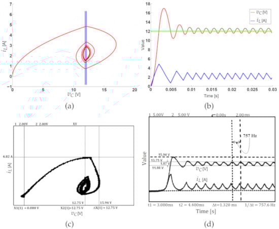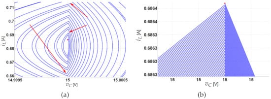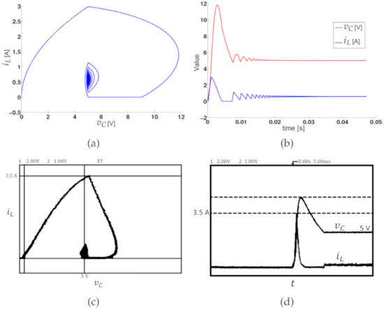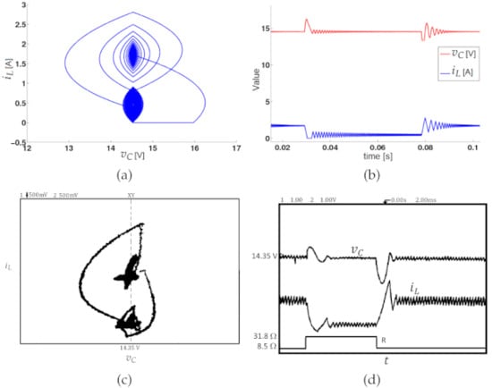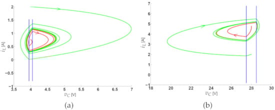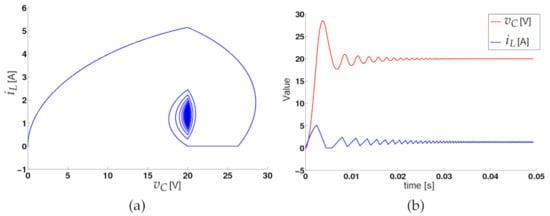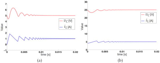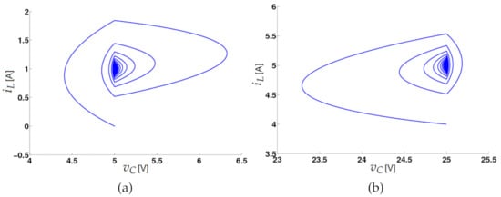 This study aims at showing the regulation capability when the chosen required voltage is low (5 V) or high (25 V) with respect to the input voltage (30 V), implying the switching of the system in two opposite regions in the phase portrait, where trajectories are switched with different vector field intensity, according to the switch S state, combining two topologies for and for in CCM. From simulation results, as shown in Figure 9a,b, it is clear that transient evolution of the resultant trajectory (merged orbit) presents an asymmetric and damped ripple due to the non-smooth nature and intensity of the vector field. Here, Figure 9a shows the simulation for a low reference voltage V, and Figure 9b shows the simulation for a high reference voltage V.