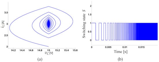 During the transient-state operation, the hysteresis control generates a variable commutation pattern, and the closed-loop system converges to the resultant equilibrium point driven by the set point as given by Equation (6). Then, the switching frequency increases as shown in Figure 11b, where simulation allows inferring that the system has a fixed point with an infinite switching frequency.