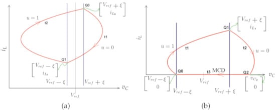 The dynamics illustrated in Figure 26a,b are obtained through simulations, in which the system slides by A, because the diode and the transistor are inactive. In DCM, the voltage across the capacitor is reduced until it reaches the lower band of the hysteresis activating the switch, and then the inductor is energized, as reflected in the increase in current . In CCM, the capacitor starts to be charged, generating an increase in the output voltage until it reaches the upper hysteresis band again.