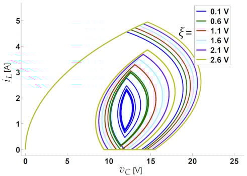 The time evolution for a typical trajectory for the Buck converter driven with constant hysteresis is shown in Figure 14, where Figure 14a shows the phase portrait and Figure 14b shows the time evolution. For this simulation case, the system converges to the stable -periodic orbit in CCM, of course with a finite switching frequency. Note that, similar to the case of zero hysteresis control, the Buck converter presents a strong transient behavior and asymmetry in the ripple when different voltage targets are required, as shown in Figure 15. Here, the simulation includes two trajectories with different initial conditions, both inner and outer, with respect to the limit cycle, to show the trajectory convergence to the stable -periodic orbit in CCM.