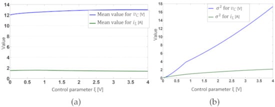 Moreover, Figure 17a shows the mean value and variance as a function parameter, where it is clear how the mean value increases and is greater than the required voltage V, due to the ripple effect. Moreover, Figure 17b shows that the variation rate presents a discontinuity that is linked to the Grazing bifurcation point at , which means that the -periodic orbit in the CCM model turns into a -periodic orbit in the DCM with .