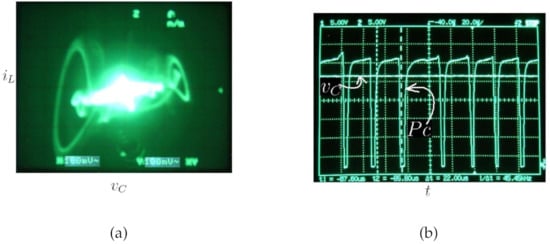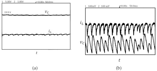 Experimental testing showed that some operation conditions lead the system to present chaotic behavior. For example, to obtain this behavior, the circuit was configured with the following values V and . For this configuration, Figure 23a clearly shows the voltage output and current signals with variable ripple, and in Figure 23b, these same signals are shown but taking into account only their AC component. Such chaotic behavior has low variable ripple because it is not possible to implement a zero hysteresis band; in turn, a residual hysteresis takes place due to physical limitations and internal parasitic effects of electronic components. This undesired behavior can be enhanced by using more technological electronic components.