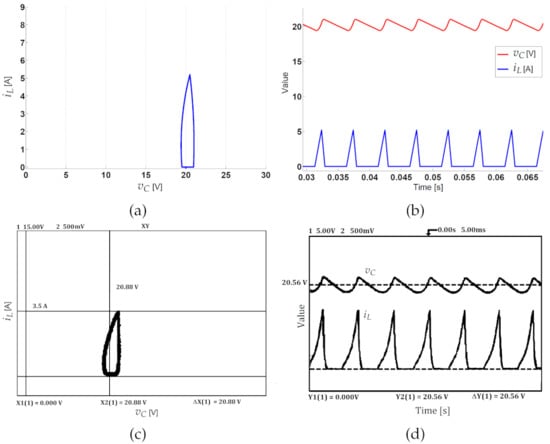 Simulations are performed to obtain the dynamic behavior in various operating conditions when the zero-hysteresis strategy controls the system. The simulation is performed with the parameters of the circuit obtained in the laboratory to contrast the results with the implemented circuit. This test aims to identify the dynamic behavior of the system during the steady- and transient-state operation. The result of the simulation is shown in Figure 8, where Figure 8a shows the phase diagram and Figure 8b shows the temporal evolution diagram.