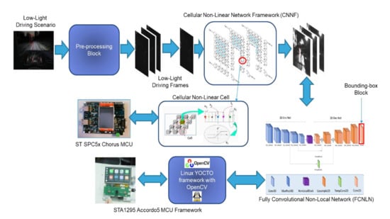 The external automotive-grade camera will be a gray-level device and, in case of color camera, the gray level image will be extracted from a classic YCbCr conversion. The single frame Dk(x,y) thus pre-processed will be buffered in the memory area of the micro SPC5x MCU [8,9,10,11] and gradually processed by the Cellular Non-Linear Network Framework as described in the next paragraph.