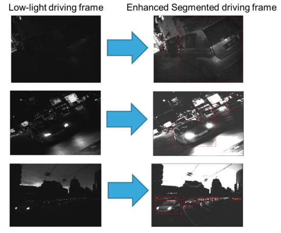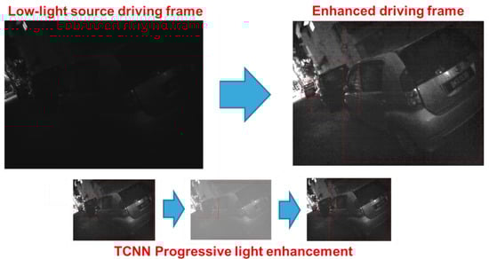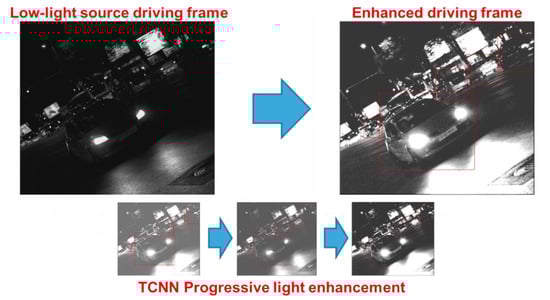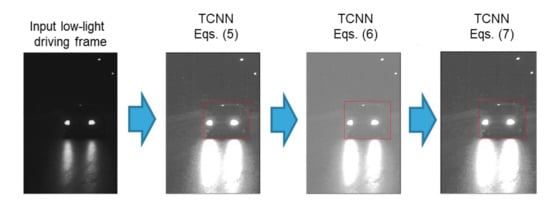 A detail of the enhanced low-light driving frames with embedding bounding-box (red box) and light-processing performed by the proposed TCNN as per Equations (5)–(7).