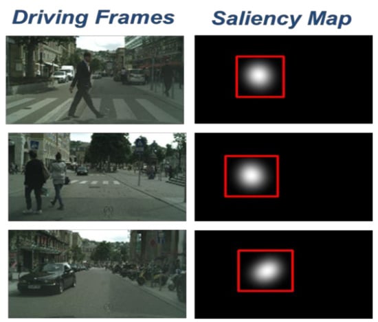 The Decoder backbone (2D Dec Net) is structured according to the encoder backbone for up-sampling/decode the visual self-attention features of the input encoder. The decoder backbone is composed by five blocks including 2D convolutional layers with 3 × 3 kernel, batch normalization layers, ReLU. Such residual connections through convolutional block are added. Ad-hoc up-sampling blocks (with bi-cubic algorithm) has been embedded to adjust the size of the feature maps. The output of the so designed FCNLN is the feature saliency map of the sample driving video frame, i.e., the segmented area of the most salient object. The following Figure 3 shows some instance of the saliency output of the proposed FCNLN applied to such video reporting the driving scene.
