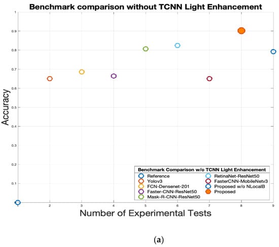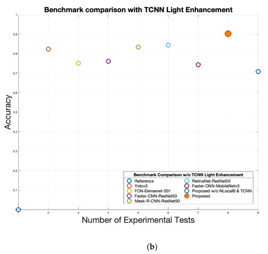 (a) Benchmark comparison in terms of accuracy without TCNN low-light enhancement pre-processing; (b) benchmark comparison in terms of accuracy with the proposed TCNN low-light enhancement pre-processing.
