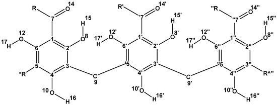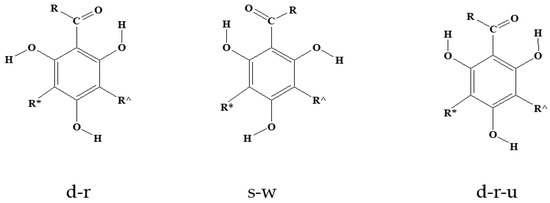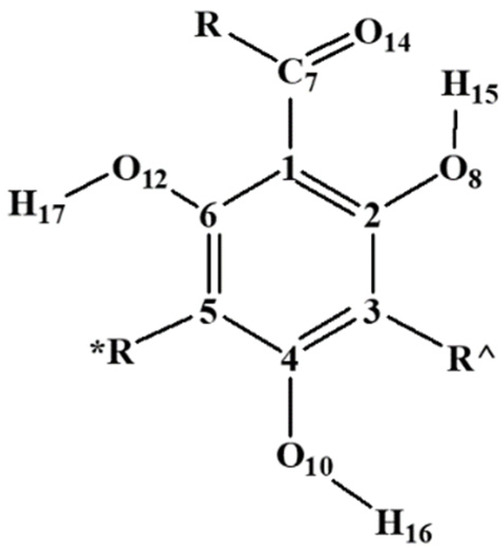 Symbols utilised to denote relevant geometry features of each monomeric acylphloroglucinol unit. In the above images, R is the alkyl chain of the R–C=O group, R^ denotes the methylene bridge for the first monomer and R* denotes the methylene bridge for the third monomer; both R^ and R* denote methylene bridges for the central monomer. In terms of conformer-types of individual monomers, the letter d informs that the first IHB is of the H15⋅⋅⋅O14 type (atom numbering in Figure 2) and the letter s that it is of the H17⋅⋅⋅O14 type. A d-type conformer is r if H16 is oriented towards the side of the first IHB and w if it is oriented to the other side; an s-type conformer is w if H16 is oriented towards the side of the first IHB and r if it is oriented to the other side. The letter u informs that the OH ortho to the acyl group and not engaged in the first IHB is oriented toward R.