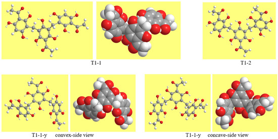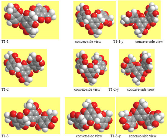 A preliminary study of T1 calculated all the viable conformers (considering all the possible combinations of orientations of the monomers and of the various OHs, and the consequent IHB patterns) and enabled the selection of the conformers to be calculated for the other molecules, excluding conformers with very high energy to avoid excessive growth in the total number of calculated conformers. Although only conformers with sufficiently low relative energy (lower than 3.5 kcal/mol, as a cautious criterion) may be involved in the biological activity of a molecule, several conformers with higher relative energies were also calculated because their comparison with the lower energy ones is useful for the evaluation of a variety of effects; furthermore, since the biological activity is exerted in a medium, they will also serve for future calculations in suitable solvents, as some of them might have sufficiently low relative energy in a certain solvent (more likely, in water) to be potentially involved in the activity [70].
