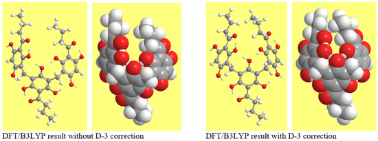 The lowering effect of the Grimme’s correction is also slightly greater for half-bowl-shaped conformers (Figure 4 and Figure 5) than for the corresponding outstretched ones, which results in the bowl-shaped conformer having lower energy than the outstretched one considerably more frequently than in the results without dispersion correction. This is likely related to the greater presence of stacking interactions between the benzene rings in the half-bowl-shaped geometries, as the rings of the outer monomers partially ‘face each other’; it also appears that the up—down—up orientation of the monomers favours this effect.