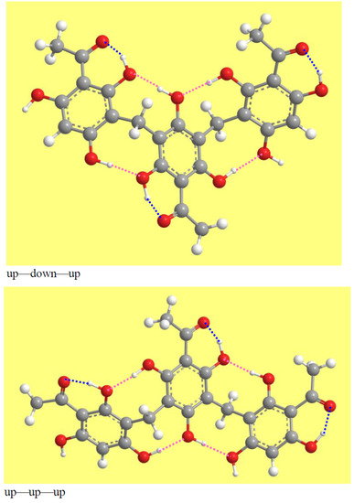 The calculated conformers have seven IHBs: a ‘first IHB’ in each monomer and four IMHBs. The IMHBs depend on the orientations of the OH groups that can form them, i.e., those at C2, C4, C2′, C4′, C6′, C4″, and C6″. Which OHs are available to act as a donor or acceptor depends on the mutual orientations of the monomers and on the orientations of the OHs. Figure 8 shows one possibility for each of the three mutual orientations of the monomers; the other patterns can be easily identified from Figure S1.