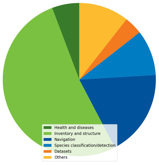 Undoubtedly, the category with greater presence in this article (more than 50%) is “Inventory and structure”. Such dominance of this category over the others can be explained by the fact that the type of works that the category embraces are mostly about forest characterisation by extracting vegetation parameters and biomass estimation (using vision and/or LiDAR), which are the most common work lines to estimate important socioeconomic variables, such as, forest yield, carbon stock, and wildfire risk. The second category with most coverage in this article is “Navigation”. This information denotes that an increasing search is being made for automation systems capable of navigating and performing autonomous tasks in forests. This is crucial, and it is expected that in upcoming years a larger number of autonomous robotic solutions may appear, since the lack of manpower is a constant issue in forestry, for both manual and machine work. The third category is “Species classification/detection”, and it is part of a relevant application domain that allows one to detect intrusive species and avoid future implications in the biodynamics of forestry areas.