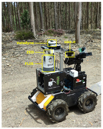 The dataset is available in the Robot Operating System (ROS) format, it is made up by nine rosbags, and it includes visible, thermal, and depth images, and even point clouds. The dataset was recorded during the navigation of the robot (manually controlled using a remote controller) in the forest, in plane and also steep terrains, at a maximum velocity of 0.5 m/s. These data were collected by means of different sensors mounted on the front of AgRob V16: a ZED stereo camera (https://www.stereolabs.com/zed, accessed on 24 September 2021), pointing forward, mounted 96 cm above ground and tilted by 10 degrees, was used to acquire visible and depth images; a FLIR M232 camera (https://www.flir.eu/products/m232, accessed on 24 September 2021), pointing forward and mounted 70 cm above ground with no tilt, was used to capture thermal images; a OAK-D camera (https://store.opencv.ai/products/oak-d, accessed on 24 September 2021), pointing to the left of the robot, mounted 96 cm above ground and tilted by 10 degrees, was used to collect visible and depth images; and a Velodyne Puck LiDAR (https://velodynelidar.com/products/puck, accessed on 24 September 2021), mounted 100 cm above ground, was used to acquire point clouds. These sensors are also presented in Figure 3 with coloured annotations. The dataset is publicly available at https://doi.org/10.5281/zenodo.5045354 (accessed on 24 September 2021), and a partial description of the same is presented in Table 5, where the data types, data resolution, frame rate, Field Of View (FOV), and number of messages associated to each sensor are detailed.