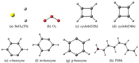To test our approach, we considered a set of eight molecules which present a multiconfigurational character. This set includes two triatomic system: the ozone molecule and the complex in its transition state structure. Moreover, we included five cyclic compounds: the cyclobutadiene molecule, studied in both D2h and D4h geometries, the benzyne ortho-, meta- and para-isomers. Finally, we included in this set the retinal protonated Schiff base chromophore with four conjugated bonds (PSB4). A scheme with all the molecules employed in this study has been collected in Figure 1. These molecules display a different multiconfigurational character and therefore a different amount of nondynamic correlation. The geometries for the first seven molecules have been taken from the work of Grimme and Hansen [20] while, for the PSB4, we have taken the geometry from the work of Zulfikri et al. [48].