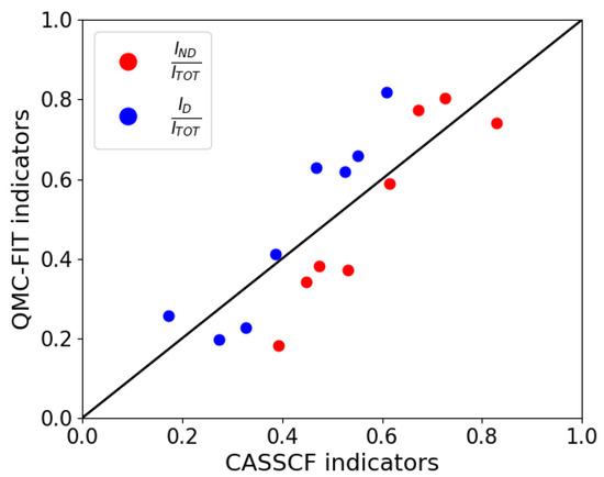 Comparison of the relative dynamic () and nondynamic () indicators with respect to CASSCF ones.
