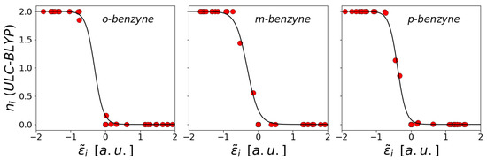 Fit of the Fermi distribution for the o-, m-, p-benzyne molecules evaluated at ULC-BLYP level. In the figure are the natural occupancies of the UNOs, while are the canonicalized single particle orbitals. In black is reported the Fermi distibution calculated using Equation (14) and the parameters collected in Table S4 of the SI.