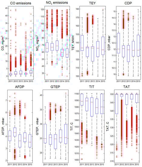 Boxplots of the process parameters and CO and NOx emissions over 5 years.
