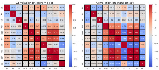 Figure 2 shows that out of four pairs of variables with a correlation of more than 0.9 for the standard CO subset, only one pair (CDP and TEY) remained in the extreme CO subset; for different subsets, the change in the correlation coefficient between these variables was very small: = 0.99 and = 0.97. It makes no sense to use both of these variables as predictors; it is better to leave one, since the presence of the second practically adds no new information. We decided to exclude CDP since energy production TEY is a more explicable parameter.