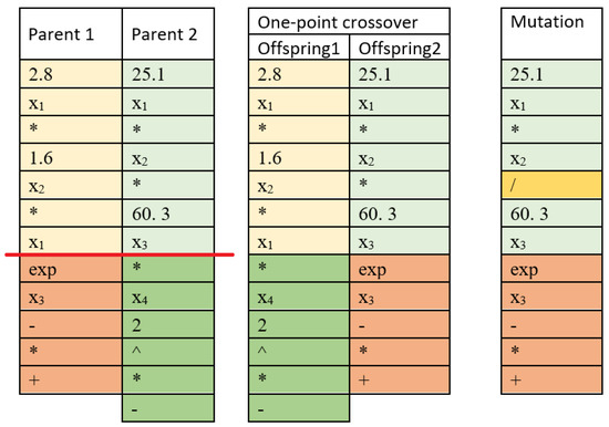 The first population (certain number) of formulae, i.e., chromosomes, is randomly generated. For each chromosome, a fitness function is calculated (the sum of the squares of the differences between the observed dependent variable and the value predicted by the generated function). Then the parents are selected, and new chromosomes are created with the crossover operation. The idea behind the crossover operation is to produce offspring by exchanging sections of chromosomes. In a single-point crossing, a breakpoint in each chromosome is randomly selected. Both structures are broken into two segments at this point. Then, the corresponding segments from different parents are “glued together” and two children are obtained. In Figure 3, the crossover point (red line) divides Parent 1 (in the first column) into two fragments, marked with light yellow and terracotta colors, and Parent 2 (in the second column) into light green and green sections, so Offspring 1 (in the third column) receives a light yellow fragment from Parent 1 and a green fragment from Parent 2, and Offspring 2 (in the fourth column) receives a light green fragment from Parent 2 and a terracotta fragment from Parent 1. Thus, the formulae after the crossover operation are as follows: