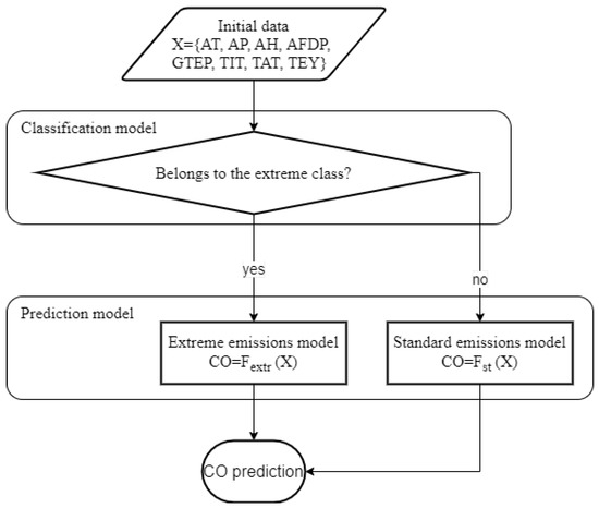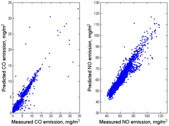 One of the essential sources of harmful pollutants (NOx and CO) released in the atmosphere is the combustion process in the power industry. NOx is a generic term for the emission family of nitrogen dioxide (NO2) and nitric oxide (NO), which are produced from the reaction of nitrogen and oxygen gases in the air during combustion. There are three main mechanisms for the formation of nitrogen oxides during gas combustion: “thermal”, “fast”, and “fuel” NOx. In accordance with the thermal theory, the rate of NOx formation depends on the temperature of the combustion zone, on the residence time of the combustion products in the high-temperature zone, and on the oxygen concentration in this zone. “Fast” NOx are formed in the initial region of the flame front in the temperature range of 1000–1500 K. “Fuel” NOx are formed from nitrogen-containing fuel compounds. Since natural gas does not contain nitrogen compounds, or contains them in very small quantities, only the first two mechanisms of NOx formation lead to emissions in gas turbines which are limited by strict environmental regulations. According to Industrial Emissions Directive, the flue gas concentrations of NOx and CO must be continuously measured from each combustion plant exceeding a total capacity of 100 MW. Predictive emission models do not require significant initial and ongoing financial costs to help prove the reliability of continuous measurements. An overview of the history of PEMS development as well as the regulatory framework can be found in [1]. There are two main approaches to model building for PEMS: analytical equations derived from the laws of thermodynamics, mass and energy balance, and data-driven models, including statistical and machine learning methods. The publication of the dataset in the open data repository of the University of California, Irvine, School of Information and Computer Science [2] in 2019 allowed researchers to start open discussion on the features of data and the quality of models derived from various machine learning methods to predict CO and NOx emissions.