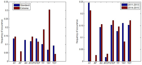 More formulae generated with the SR procedure are given in Appendix A.1, Appendix A.2 and Appendix A.3, they differ in the number and composition of the terms. The influence of the parameter can be determined by the frequency of occurrence of the corresponding variable in the formulae. We collected a set of 20 formulae for each class for CO and each subset for NO and calculated the frequency of using the input variables, which is shown in Figure 5. Some conclusions can be drawn about the importance of the parameters and features for different cases. is not included in any formula for extreme CO emission (remember the statistical insignificance of the correlation coefficient ). and are rare (the latter is not the most obvious fact, as with a sharp increase in energy production, a sharp increase in CO emissions can be expected). The most important parameter for extreme CO prediction is . For standard CO emissions, the frequencies of , , , are in the range of 0.12–0.13, followed by , and . is not present in the formulae, its role in standard CO emission prediction is negligible. For NOx emissions, we see the negligible importance of and parameters for both subsets. has the highest frequency of occurrence, , , , have roughly equal frequencies, the difference between subsets 2011–2013 and 2014–2015 is in frequency of . This fact may have a technological explanation, as we indicated in Section 2.