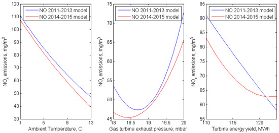 Nevertheless, it is interesting to compare the influence of some predictors on the outputs of the models for NOx emissions built for the periods of 2011–2013 and 2014–2015. Figure 6 shows graphs of NOx emissions versus AT, GTEP and TEY, with the other explanatory variables held constant. For different periods, the trend in the parameters remains; as already noted, for the period 2014–2015, NOx emissions are slightly lower than for 2011–2013 under the same conditions.