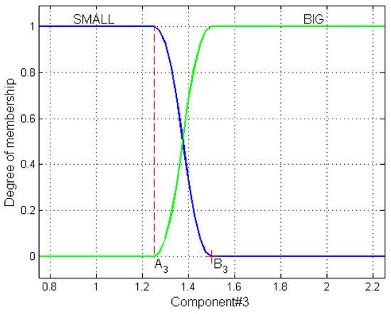 We selected components and defined them as input variables for FIS with two terms: “Big” and “Small”. The nonlinear S-shaped membership function with two parameters A and B describes the term “Big”. Parameter A defines the left bound of the component’s values, where the membership function equals 0, and B defines the right bound of the component’s values, where the membership function equals 1 (8):