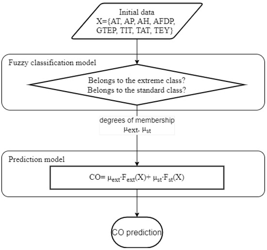 The metrics for the obtained fuzzy classification model for a testing set are given in Table 3. As one can see, the metrics are slightly better compared to the first crisp classification model Table 2. To test fuzzy classification model and to calculate -score for the testing set, we transformed fuzzy subsets to crisp ones, but our goal is to use the advantages of the fuzzy logic approach, and use the degrees of membership to each class to obtain a better prediction for CO emission. The flowchart of the algorithm is given in Figure 10.