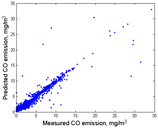 Figure 11 shows predicted and measured CO emissions for the testing set using fuzzy classification model and SR formulae (3) and (4). The metrics are MAE = 0.27 mg/m3, . Compared to the previous model (see Figure 7), one can notice that the points are better grouped around a line, the sharp transition between the areas where there was a boundary between classes disappeared. Approximately 10 points are located at a significant distance from the line; in these cases, the prediction error is large, which can be explained by the large time interval (1 h) when forming the input data vector.