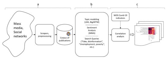 The employed methods included the following steps (Figure 1): text corpus collection (a), text corpus processing (b), and correlation analysis using the objective data on the epidemiological situation (c).