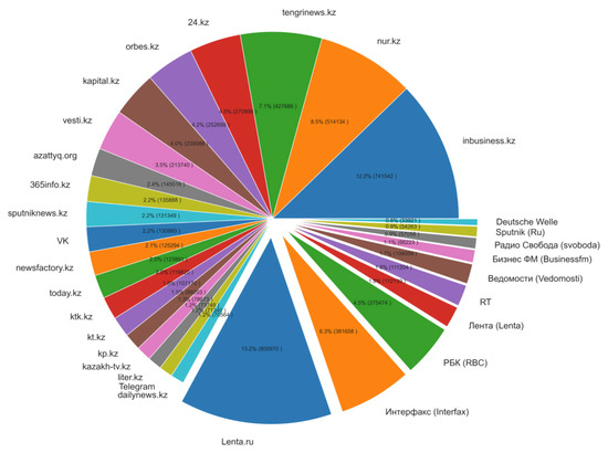 The analyzed media sources publish news articles in three different languages: Russian, English, and Kazakh. For the purpose of comparing Kazakhstani and Russian media, only the news in Russian was considered. Since all three languages use distinctly different alphabets, the filtering was based on simple character-frequency statistics. Next, the news in the Russian language was lemmatized using the PyMyStem3 library [58]. A list of stop words provided by the stop-words Python library [59] was applied.