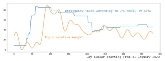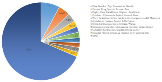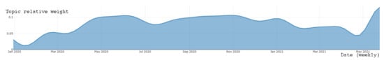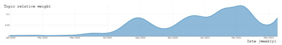 The third approach aimed to perform an analysis of specific search queries constructed by experts. It allowed the testing of the specific hypothesis by manually defined search queries without relying on the topic model to distinguish the corresponding topics. The list was composed based on the assumption that the COVID-19 pandemic had significantly affected almost all areas of human activities [61], including healthcare, the economy (unemployment, crisis, poverty) [62], remote work and education [63], crime rate [64], and the abundance of fake news [65]. In the list, we attempted to encompass the most important areas that might have been affected by the COVID-19 pandemic according to common sense and literature review.