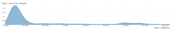 The obtained topic models were used in order to calculate the relative weight of each of the topics. The relative weight was calculated daily in order to be able to analyze the topics’ dynamics within the publication activity. The relative weight of a topic is a ratio of a column of the θ-matrix, representing the given topic in relation to the sum of the whole θ-matrix. The relative weight ranges from 0 to 1 and shows the ratio of information related to the given topic in the information field described by the corpus under analysis. Figure 4, Figure 5 and Figure 6 show the dynamics of weekly relative weight of 3 of 100 topics within the level-2 topic model.