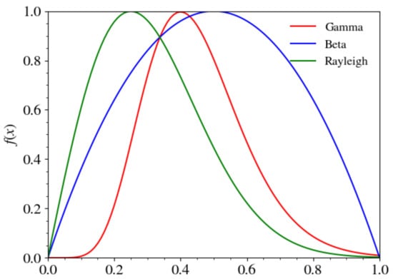 To obtain a sequence of PRNs with a probability distribution with the AR method, one generates two equal-length sequences of PRNs x and y with uniform distributions and then selects (accepts) the values of x that satisfy the condition []. The Beta, Gamma, and Rayleigh distribution functions that we consider in this work have acceptance rates of , , and , respectively. Figure 1 shows these functions for using normalization .