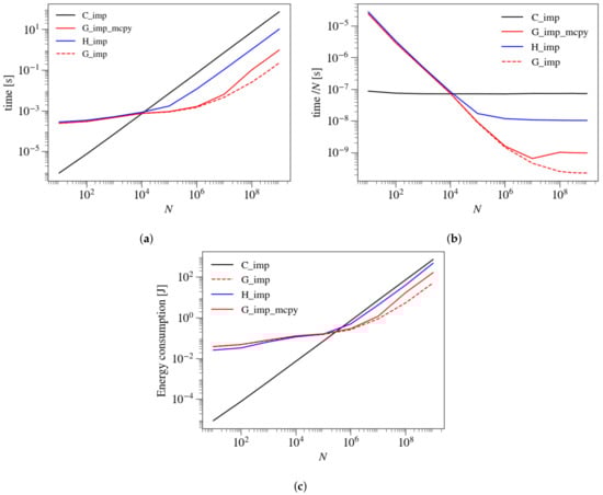 The utilization of the GPU increases with N and the GPU becomes faster than the CPU at . At , the GPU-based implementation is times faster than the CPU one. The H_imp implementation performs faster than C_imp by a factor of seven, roughly, but performs slower than the G_imp implementation by a factor of .
