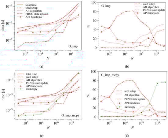 For , the seed time consumes more than of the overall time, reaching at . The PRNG state update takes less than for . The fraction of the PRNG state update grows to for . The AR algorithm takes less than for but then grows with N gradually and reaches for . The rest of the execution time goes to API function calls, the fraction of which is for , but drops below for . However, as we will see below, these findings depend on the PRNG parameters, including the seed setup and the state size. The G_imp_mcpy implementation, shown in Figure 3c,d, exhibits qualitatively similar breakdown of the total cost for . However, the contribution of data transfer to the GPU becomes dominant for (e.g., at , it reaches ). Hence, the relative contributions of the rest of the computations, including the AR algorithm, become smaller compared to those in the G_imp implementation.