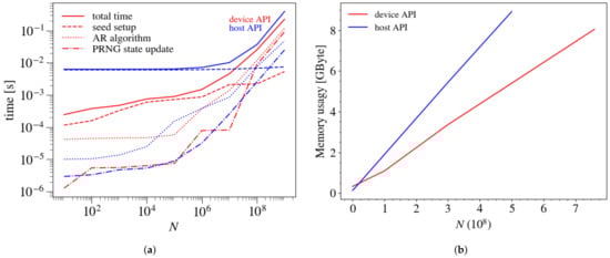 Figure 5 shows the execution time for different PRNGs as a function of N for the host (Figure 5a) and device (Figure 5b) API implementations. Since in this section we compare different PRNGs, we consider only uniform distribution sequences in order to exclude the impact of the AR calculations. Note that since the MT19937 implementation does not support device API [], it is omitted from Figure 5b. As discussed above for the MRG32k3a PRNG (cf. Section 3.3), the longer seed setup time in the host API implementation leads to longer execution times, especially at lower N. We find a similar difference between the two implementations for the rest of the PRNGs considered here.
